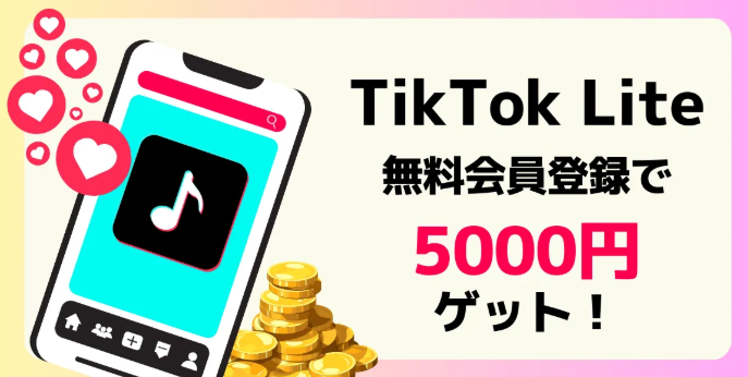 あの有名なショート動画アプリ「TikTok」の軽量版なのですが、今、このTikTok Liteで新規登録するだけで5000円分のポイントがもらえるキャンペーンを実施しているんです!